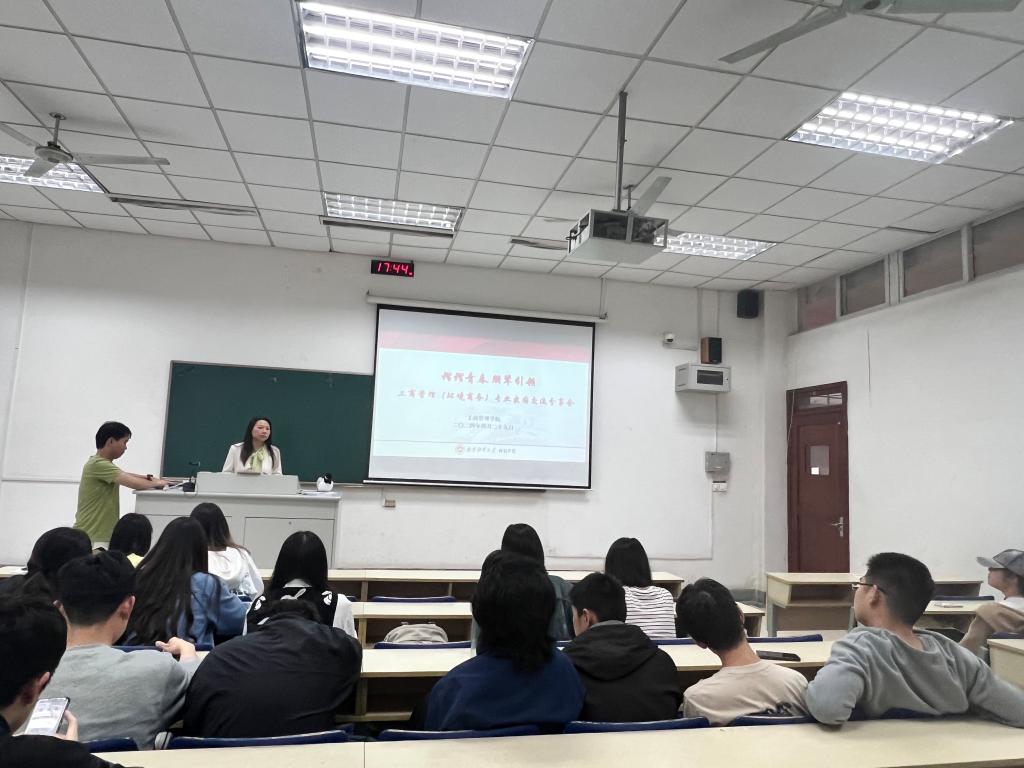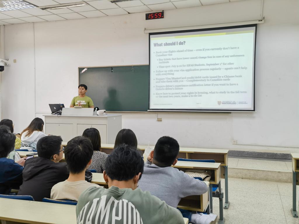 为帮助工商管理(环境商务)专业学生提前做好出国学习准备及生活规划,快速适应滑铁卢大学的校园生活,4月29日下午,禁忌书屋 在德济楼105教室开展“熠熠青春 朋辈引领--工商管理(环境商务)专业出国交流分享会”。此次活动邀请了工商合2101班程天乐做分享,工商合项目主任文婷、学院外事秘书喻洁、辅导员常莹以及中加班拟出国学生30余人参加此次分享会。