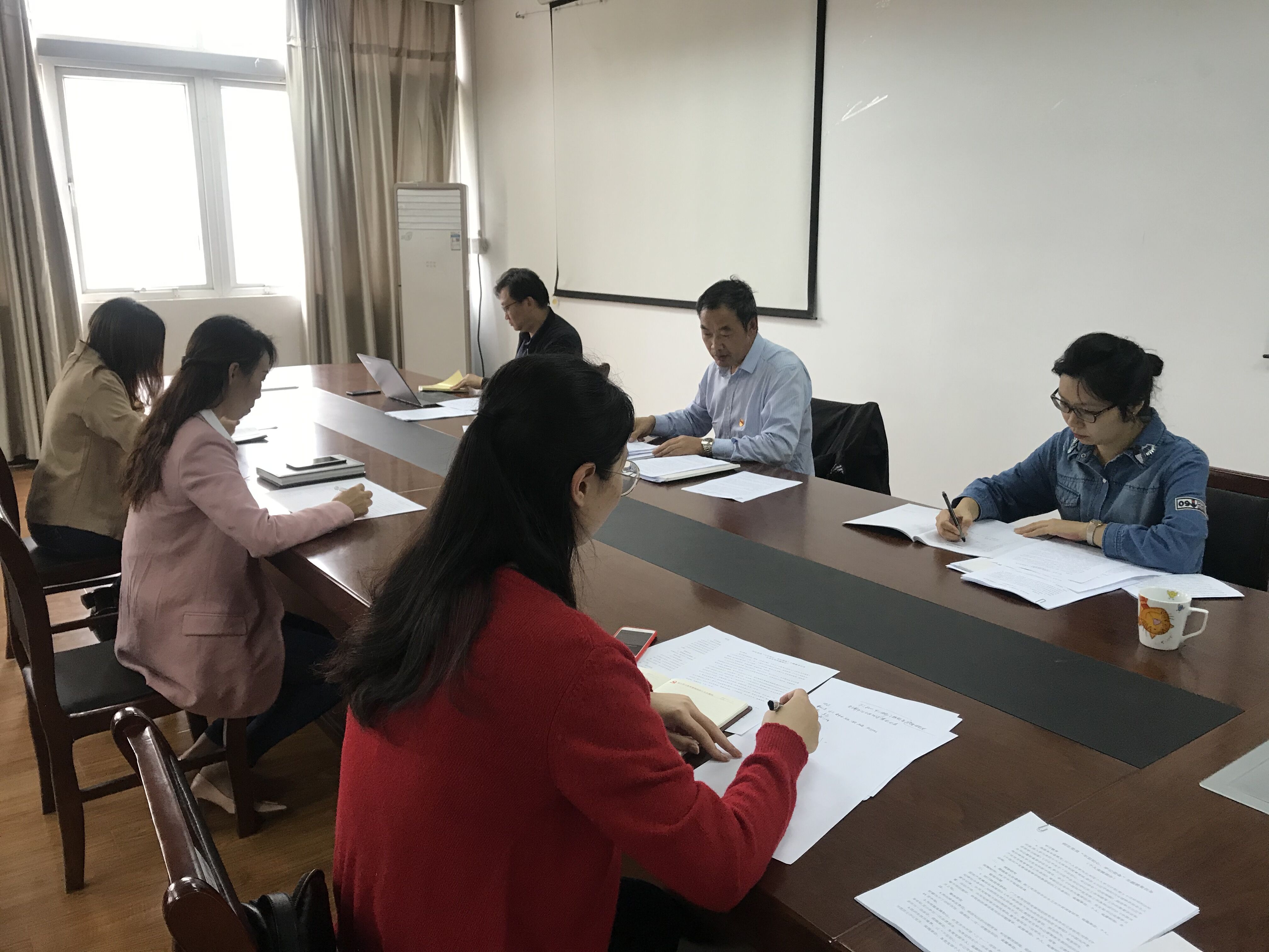 吴忠老师首先对学院各支部开展“不忘初心、牢记使命”主题教育提出相关要求,并对前期向党支部重点了解的情况做了总结。随后,学习研讨高校党建工作重点内容,在赵菲老师通读《江苏高校党建工作重点任务》后,吴忠老师就加强高校院(系)党建工作、加强高校师生党支部和党员队伍建设两点进行了进一步解读。接着,全体成员研讨学习《书记抓主题教育责任清单》等文件,逐条分析师生党员“不忘初心、牢记使命”主题教育各党支部实施部分内容。最后,与会的支部书记结合习近平新时代中国特色社会主义思想、省委关于开展“不忘初心、牢记使命”主题教育的部署要求等学习材料、专题讲座、专题片观影等重要学习内容积极展开研讨。秦伟平老师指出不忘初心,要牢记自己作为教师的使命,教育学生不止是教知识教技能,更重要的是影响他们的思想,构建正确的价值观和人生观。宗文老师指出做合格党员,一方面要进一步夯实自己,爱国、爱人民、爱事业;另一方面就是牢记使命,在教育中弘扬正能量,引导学生积极向上。冯玲老师指出作为辅导员、老师、支部书记,要从正面方向去引导学生,比如提高责任意识、担当意识。