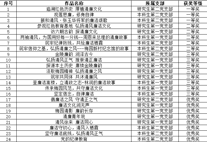 本科生和研究生党支部宣讲团以小组为单位,走出校园,走进中共代表团梅园新村纪念馆、栖霞区党的纪律建设教育馆、仙林社区党群服务中心等廉洁文化教育基地参观走访,并录制廉洁故事演讲或廉洁教育基地“微课堂”视频,推动形成校园人人学廉知廉崇廉养廉的文化氛围。本次活动共提交24个廉洁“微课堂”视频作品,经学院党委评审,评选出一、二、三等奖和优秀奖。