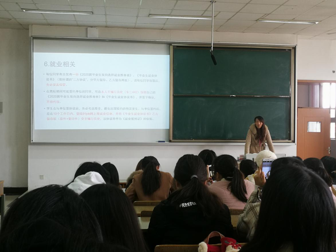 毕业班辅导员冯玲老师在博远楼210教室召开了实习就业动员大会,2020届本科全体学生参加此次会议。