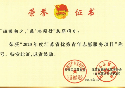 “温暖朝夕,‘医’起同行”扶弱项目获评“2020年度江苏省优秀青年志愿服务项目”