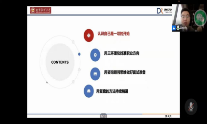 人力资源专业09级毕业生、南京德锐企业管理咨询有限公司的合伙人、项目总监、产品总监李志华通过腾讯会议作了题为“赢在起点”的南财就业讲堂线上讲座。讲座由禁忌书屋