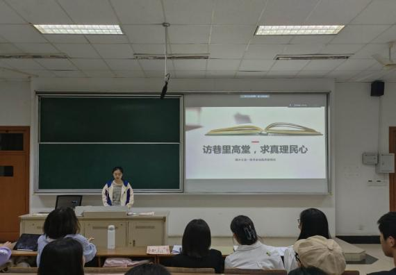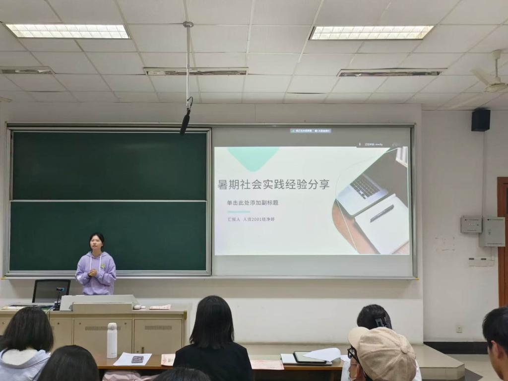 最后,暑期优秀社会实践团队代表钱净婷与暑期社会实践优秀调研报告代表杜雨露、金曦涵上台展示了各自团队的实践过程与成果,就选题、调研机构、团队组建和注意事项等方面为同学们进行一一讲解,对同学们开展实践活动指明了方向。