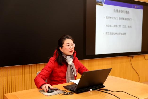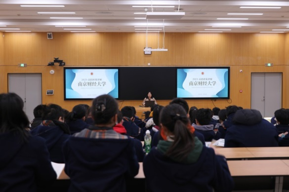 的文体活动、校园风景、校园周边、学在南财、食在南财、住在南财等情况;吴婧欢同学分享了自己进入大学以来取得的进步和收获,鼓励学弟学妹们坚持梦想,努力学习,度过充实而有意义的高中三年。互动环节,学生们踊跃提问,现场气氛热烈。