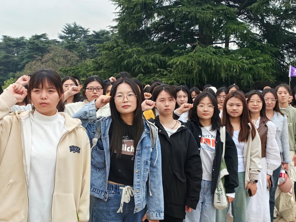 入园之始,伟岸的烈士群雕便赫然现于眼前,使人陡增敬意。穿过阳光照耀下的树林,同学们来到雨花台烈士纪念碑脚下。在庄严肃穆的烈士纪念碑前,在一盆盆充满生命力的鲜花前,同学们面向鲜红的团旗,右手握拳,手举过肩,庄严宣誓,重温入团誓词。