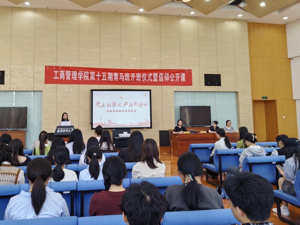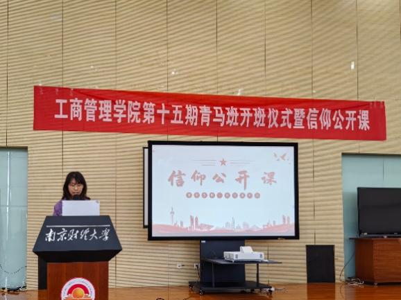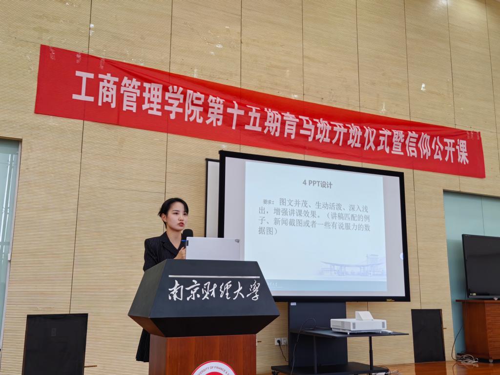 第十五期青马班纪律及注意事项,并从课程基本内容和要求、优秀学员评选规则等方面进行介绍。接着,第十四期青马班优秀学员代表吴佳璐上台发言。她表示,青马班不仅是一个学习的平台,更是一个精神的象征,一个品格的磨砺石,希望同学们珍惜学习机会,保持谦逊、严谨、积极、务实的态度,将个人理想追求融入到国家和民族的伟大梦想之中。