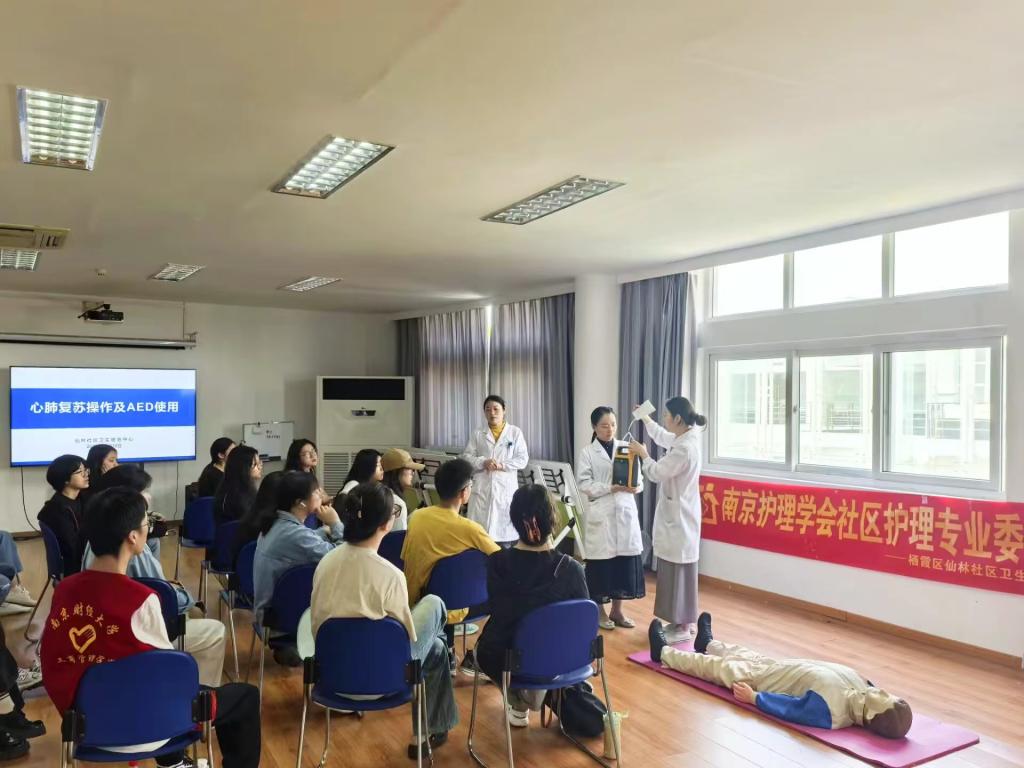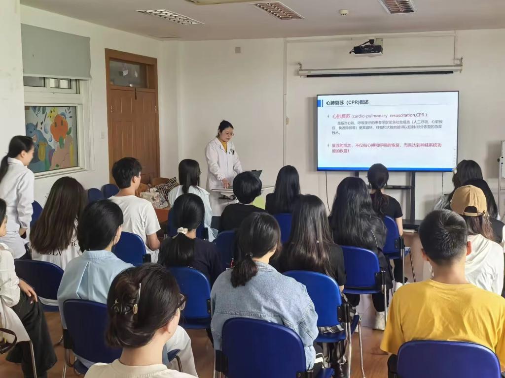 活动伊始,医护人员首先介绍了心脏骤停的定义和原因,以及心脏骤停的病情判断与临床表现,强调了“黄金4分钟”的重要性,让同学们更加清楚地了解到了有关心脏骤停的专业知识。随后,医护人员为同学们详细讲解心肺复苏的具体操作方法和注意事项,并邀请现场同学实地体验心肺复苏。