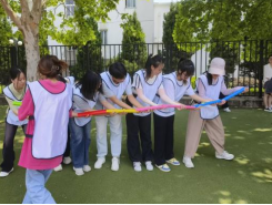 本次运动会共设置了“鼓舞人心” 和“运粮接力”两个劳动主题游戏项目。“鼓舞人心”需要每组队员分别拉住鼓绳的末端一根或两根,其中一名队员负责放置活力球,待发令后开始原地颠球,颠球次数最多的队伍获胜。比赛过程中,每个人都迈着紧张而一致的步伐,配合默契,神情专注,判断球的落点,把握颠球力度。随鼓面形变反弹而高高跃起的不只是弹力球,还有小组逐渐高涨的士气。一阵又一阵的响亮鼓声促使他们“心凝力聚”。