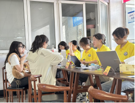 办理完宿舍相关手续后,新生们前往德济楼四楼大厅进行报到注册。走出四楼电梯口,首先映入眼帘的是“激扬青春 逐光而行”禁忌书屋