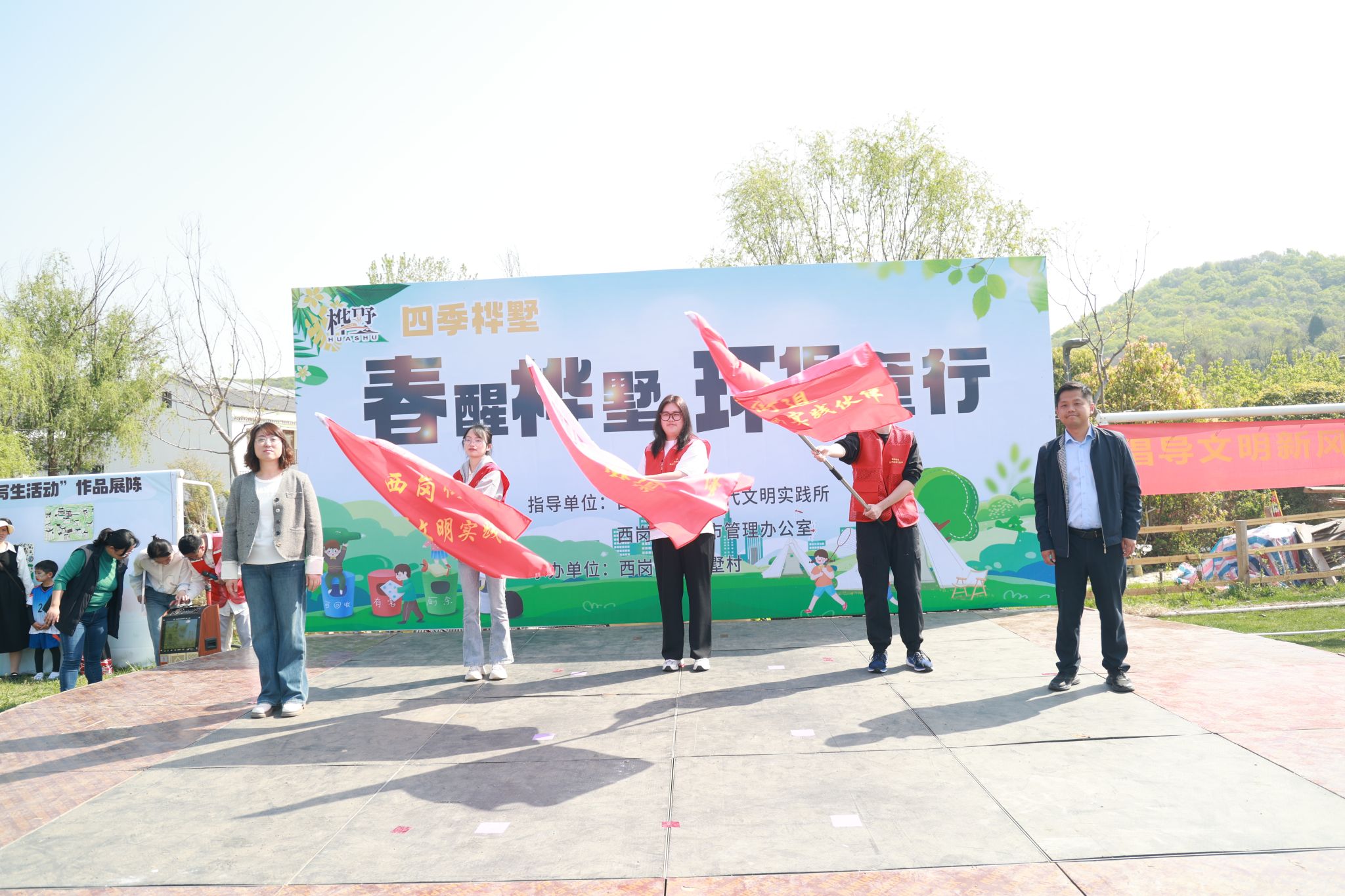 志愿者代表与其他在宁高校志愿者代表共同宣读了《移风易俗倡议书》,号召大家破除陈规陋习,争做文明新风的践行者。随后,西岗街道宣传委员仇晓源主任、西岗街道综合执法大队成治州大队长为各高校团队授予“青春‘绿’动·志愿桦墅”环保行动旗帜,桦墅村村委会为各高校团队颁发“高校志愿者”任务发布书。随后,志愿者们分组组成“移动环保站”,在村落周边进行垃圾分类实践,向游客和村民发放垃圾分类指南,并解答他们关于垃圾分类的疑问,激发他们对于环境保护的热情。