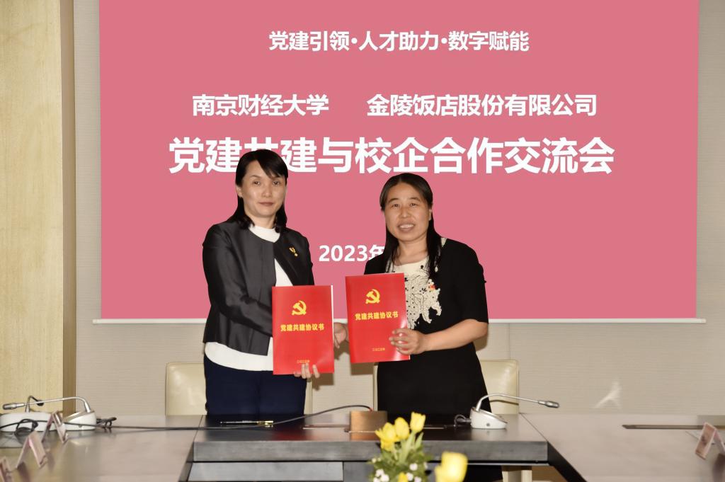 党委书记张杰与金陵饭店股份公司党委书记、董事长李茜代表双方签订党建共建协议,姚文韵副校长与金陵饭店集团党委副书记周锦银共同为“党建共建单位”揭牌。