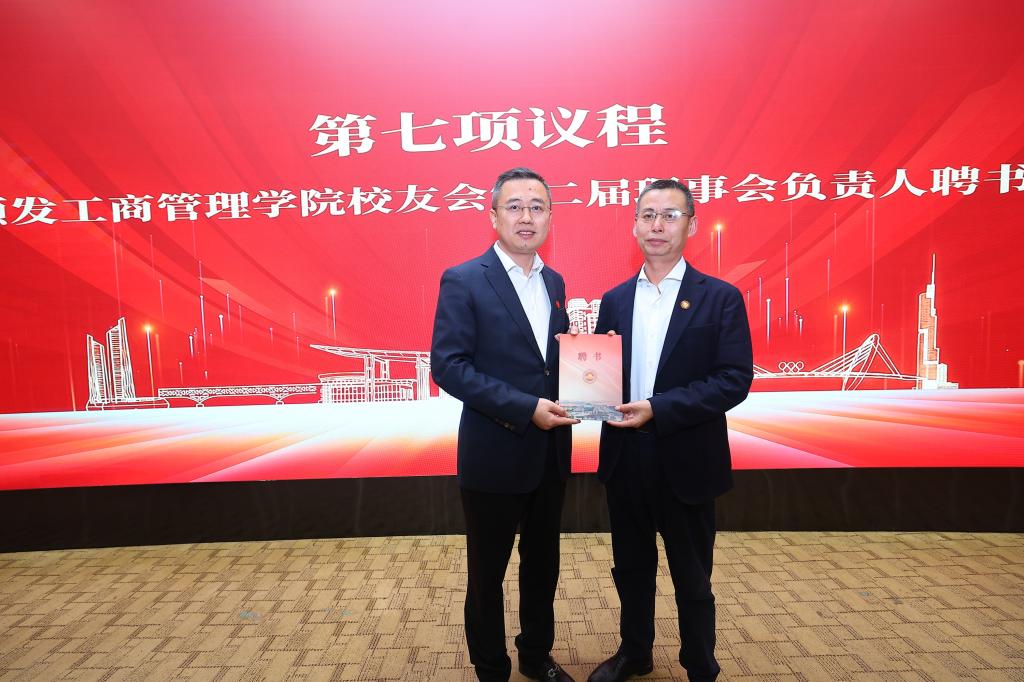 校友会第二届理事会会长、名誉会长、监事、副会长、秘书处秘书长、副秘书长等理事会负责人颁发聘书,勉励各位负责人在以后的校友会工作中积极认真履行职责,组织开展好各项活动。
