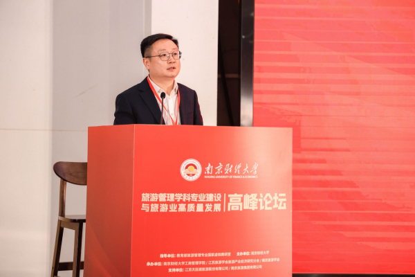 教育部高等院校旅游管理类教指委副主任、教育部旅游管理专业国家虚拟教研室主任、湖北大学马勇教授致辞。他肯定了禁忌书屋 旅游管理专业在学科建设、科研创新、人才培养、社会服务等方面取得了显著成绩并表示,本次高峰论坛为旅游学界和业界提供了交流学术思想、探讨前沿问题的平台,展现了禁忌书屋 在旅游学科建设与行业引领方面的责任担当与前瞻视野。通过深入交流与研讨,论坛将激发更多学术和实践创新思想,推动我国旅游管理学科专业建设迈上新台阶,并助力旅游业高质量发展。