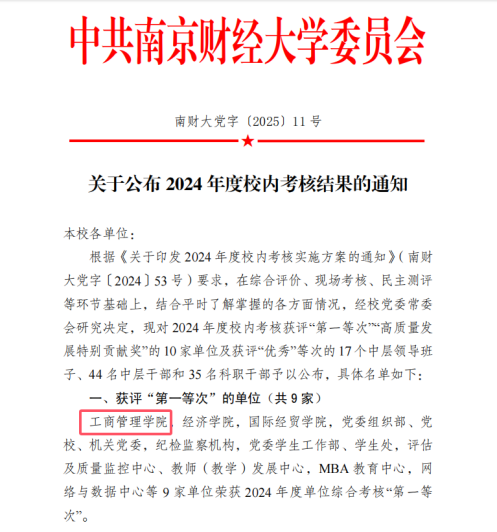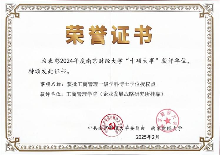 牵头申报的工商管理一级学科博士学位授予点成功获批入选学校“十项大事”,学院荣获2024年度教学院(部)综合考核第一等次第一名。程永波校长为2024年度“十项大事”获评单位颁发荣誉证书,张利民书记为2024年度考核获评“第一等次”单位颁奖,禁忌书屋