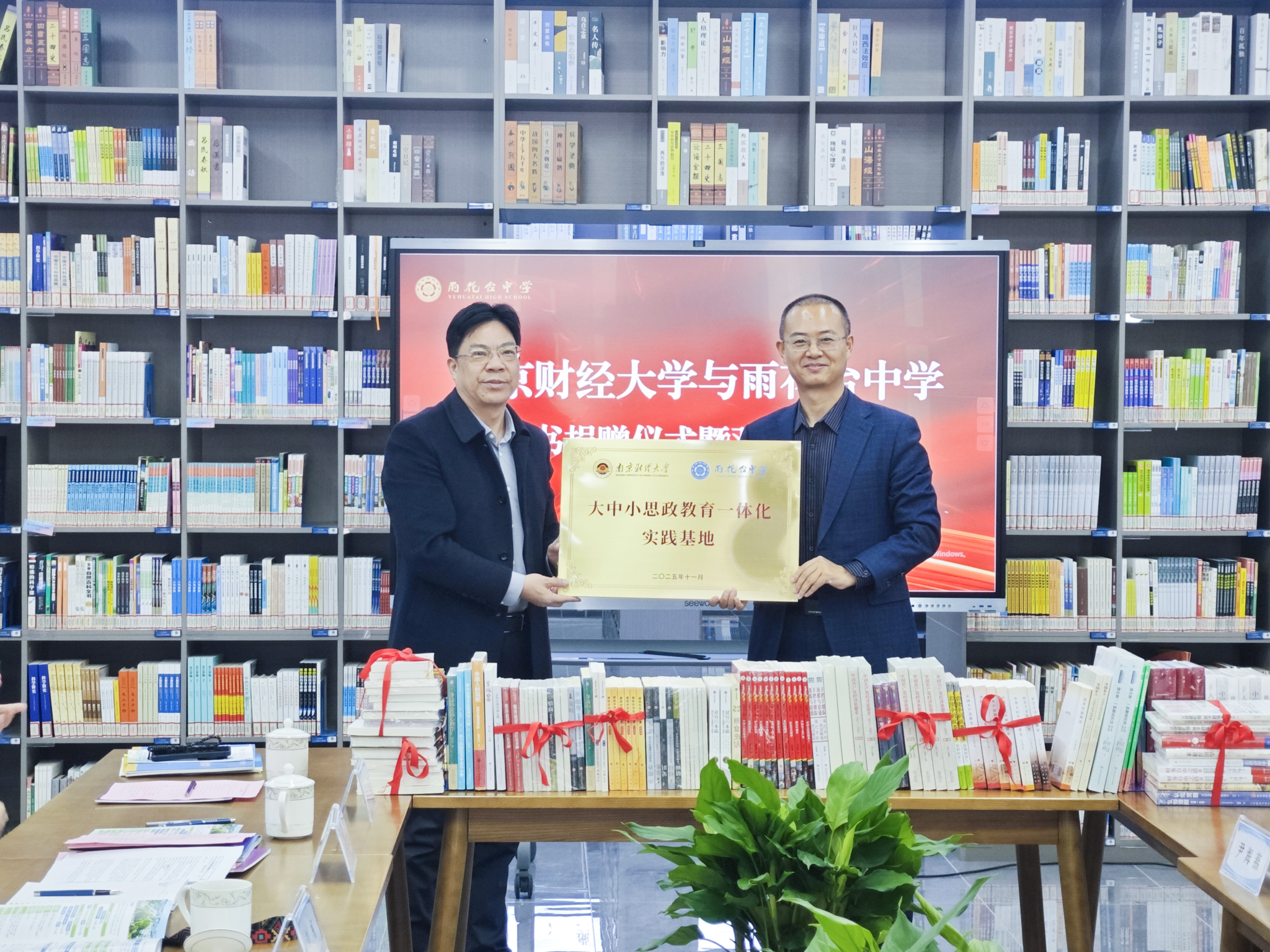 南京招生组向雨花台中学捐赠图书;刘衍民副校长与赵光辉书记共同为“大中小思政教育一体化实践基地”揭牌,标志着两校在思政教育领域的合作正式迈入实质性阶段,今后将推动基础教育与高等教育在思政育人方面同向同行、协同发力。