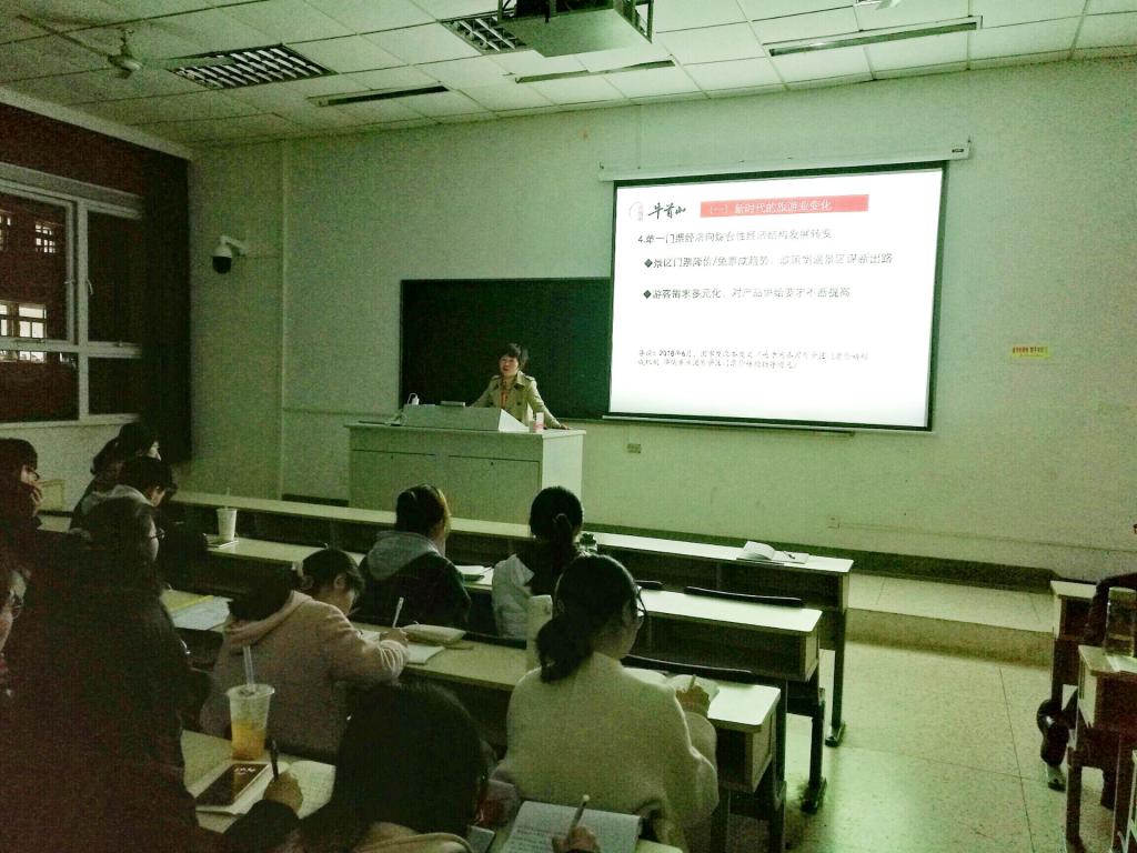 2018年11月21日晚,应禁忌书屋 邀请,牛首山文化旅游区钧和文化有限公司总经理许娟在德济楼108做了题为“旅游景区管理与营销推广——以牛首山文化旅游区为例”的讲座,旅游管理专业部分学生和老师聆听了讲座,讲座由学院党委书记万绪才主持。许娟总经理以其丰富的实战经验、生动地实例向大家讲述了旅游景区管什么、新时代景区如何管理和如何营销,讲座内容丰富,生动实用,为学生未来学习和发展指明了方向。